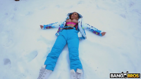 Страшненькая бабца с большими сиськами, на которых околососочный кружок не в меру темный и большой, отправилась с другом из порно студии отдыхать на заснеженную локацию, где можно неплохо отдохнуть в чуть холодном климате, покататься на сноубордах, а еще снять очередное видео для взрослых. Уже после ската по склону, она немного пососала замерзший хуй, после чего коллеги отправились в домик для отдыха, где во время душа актер с камерой вновь побеспокоил шкуру, дав на клык. Когда же он отправился в комнату, подруга быстренько домылась и прискакала завершить начатое.