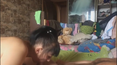 Пока жена на работе, дети в школе и садике, глава семейства развлекается со шлюхами. Недорогое удовольствие стоило всего пару тысяч, а использовалось несколько минут, большую часть из которых отвелось на минет. Проститутка поинтересовалась у клиента - как он хочет, с гондоном или без. Конечно, он ответил, что с резинкой, побаиваясь чем-нибудь заразиться, а там и жена узнает о неверности любимого. Просто от скуки мужчина попердохал черноволосую ночную бабочку, накончав в презерватив и отправив работницу секс индустрии в душ подмываться перед следующим клиентом. Из приличия девушка спросила не хочет ли он еще, ведь в запасе осталось 40 минут, но нет, мужчину и так хватило ненадолго.