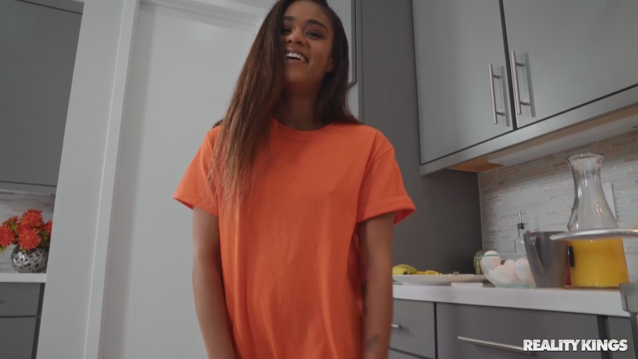 Негритянка проснулась раньше своей второй половинки и решила порадовать его завтраком. От вкусного аромата парень проснулся, не одеваясь пошел смотреть откуда доносится этот чудесный запах и обомлел. Внизу стояла возлюбленная в одной футболке и занималась готовкой. Это только начало совместной жизни, а волшебная арапка уже покорила сердце бойфренда. Вид красивой попки не оставил равнодушным сожителя и он, прямо на кухне, взял брюнетку, круто оттрахав на стуле и отлизав на столе. После хорошего секса можно и позавтракать с улучшенным настроением. Всем подобных хозяек, а девушкам - любовников!