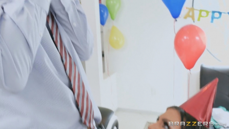 Женщина все утро надувает шарики, развешивает побрякушки, напоминающие о дне рождения супруга, который должен заявиться с минуты на минуту. Час икс настал, супруга спряталась за диваном. Услышав шаги, она выпрыгнула голая и тут же закрыла сиськи рукой - перед ней стоял коллега мужа, закрывающий глаза ладошкой, как джентльмен. "Я все утро готовилась, чтобы все испортить?! Ну уж нет, будешь трахаться вместо моего законного опоздуна". Дама врезала тортом в лицо гостя, обмазала кремом соски и принялась заниматься сексом с офигевшим от такого исхода мужчиной, чей член был восхвален изменщицей за размерчик.