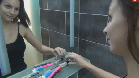 Мастурбирует расческой перед зеркалом
