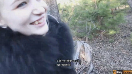 Молодой человек шел по лесу и увидел как недалеко от дорожки ласкает себя какая-то незнакомка, приподняв куртку и юбку. "Девушка, а что вы тут делаете? -Гуляю". Парень предложил помощь, но застенчивая отвернулась и отказалась от дружеского предложения. Самой-то ей хочется секса, но не с первым встречным же, вот действительно! Долго русская блондиночка не ломалась и рука прохожего уже гуляла в трусиках, а сама стесняха сосала морозный член. После оральной любви пара переключилась на перепих с приятным хрустом веток на земле, сменив пару раз позу, а лесная онанистка пальцем вынула семя из нутра, дакнув на прощание.