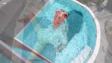 Маленькое сокровище пошло искупаться в бассейн, расположенный под открытым небом. На улице довольно жарко, что не мешает тайской малышке пофингерить заросшую дырочку. Ее манда очень возбуждена, истекает соками и сейчас бы не помешал толстый хуй, давший удовлетворение узкоглазой брюнеточке, но есть только свои пальцы, проникающие в сочное влагалище. Сделать шикарным почти грудастое тело помогло масло, заблестевшее на воздухе и снизившее температуру тела азиатки. Додрочив до блаженства, телочка пошла вновь загорать, плавая на надувном матрасе для воды в виде арбузной дольки, раскинув ноги в сторону.