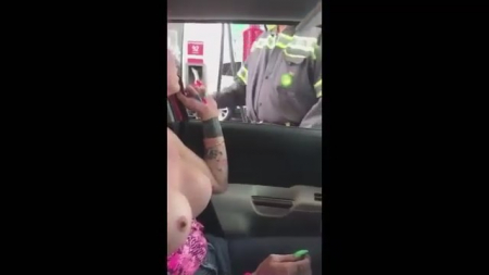 Сученька с розовыми волосами покормила тачку бензином. Пора расплатиться карточкой на терминале у стоящего на выезде чувака в спецовке. Он слегка охренел когда увидел, что водительница сидит с голой грудью, будто так и надо. На секунду мужчина замолчал, объясняя что и как по своей работе. Ему так захотелось потрогать большие силиконовые сиськи, что он взмолился их полапать, хотя бы одну. И да, ему разрешили, несмотря на то, что рядом на пассажирском сидении снимал ее молодой человек, который не против таких приколов подруги. Воздушный поцелуй и красотка покатила дальше получать все от этой жизни.