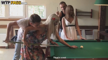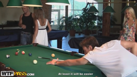Молодые русские ребята арендовали огромный дом, натыканный развлечениями, а самое главное - шикарной сауной, в предбаннике которой они расположились возле столика, за ним удобно бухать и говорить с телками, есть кровати и прочее. Раскрепощенные девушки не поверили, что их подруга займется сексом сразу с двумя парнями и та не дала слабину, а разделась и действительно отдалась без двойного. Проверить ход дела остальные решили заглянув в окно и, убедившись, отправились дальше играть в бильярд. Когда шлюшке обкончали лицо и немного сиськи, то отправили помыться.