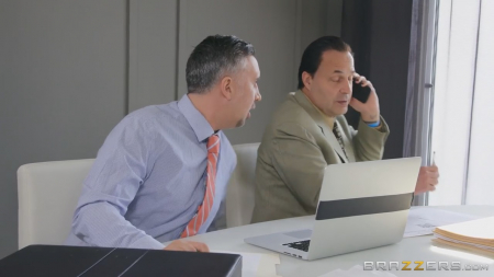 Офис закрыт, потому начальнику и его заместителю пришлось собраться вместе у первого дома. Мужчина раньше не рассказывал, что у него есть дочка, которая как раз вернулась из магазина, где провела все утро с подругами. Разбалованное носатое создание хотело внимания папочки, но занятой мужчина попросил пока что не тревожить, представив девушку гостю. Батя отвлекся на телефон, а развратная дочка показала сиськи визитеру, начав гладить ногой член под столом. Стояк появился моментально. Сучка написала записку, в которой предлагалось пройти к ней в спальню, пока хозяин отвлекся. Там любовники успели дико перепихнуться, телочка вновь собралась валить прямо со спермой на ебле, а поправляющий рубашку подчиненный вернулся за стол заниматься работой.