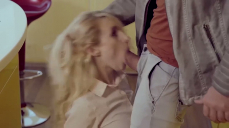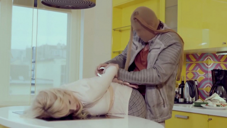 Насильник в приподнятом настроении зашел в чужую квартиру. Дверь была не заперта, хотя родители не зря учат закрываться. На кухне готовила ничего не подозревающая женщина, спиной она не могла видеть постороннего в колготках на голове, на цыпочках подкравшегося поближе. Блондинка закричала "помогите", а ее рот заткнули куском огурца, потом вместо него членом. Этот процесс не особо порадовал хозяйку. Чтобы та перестала сопротивляться, на ее руки надели наручники, правда, потом они оказались не нужны, ей стало нравиться и даже пилотку себе теребила в процессе. Только посмотрите какая довольная сидит с обконченной грудью!