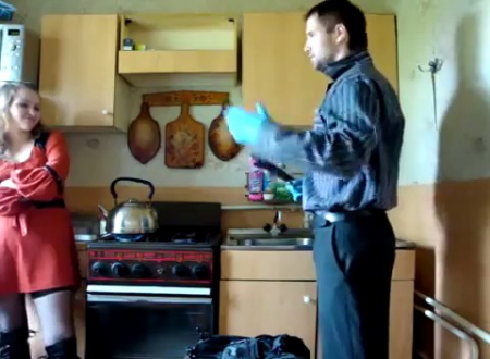 Очень фигуристая везде девушка предложила любимому сыграть в ролевую игру. Он должен как сантехник лежать и делать вид будто чинит кран, а она его обхаживать. Якобы он настолько легко поддается соблазну, что с самого начала лежит уже без штанов. Хозяйка взялась дрочить его вялый пенис пока он не подрос и забралась сверху, долго прыгая в такой позиции. Следом они подошли поближе к камере и в самом финале девка забралась на сложенный столик. Последние пару минут особо ничего не видно, он типа кончил внутрь клиентке, надел штаны и собрался покинуть квартиру. А кран доделывать-то кто будет?!