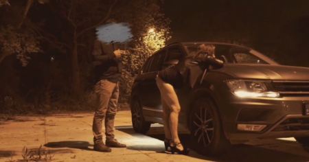 Мужчина сам привез на своем автомобиле жену и ее любовника, чтобы тот ночью на безлюдной улочке ее выебал, пока немецкий куколд стоит за ними и дрочит маленький пиструн. Соблазнительница виляла попкой на улице перед парнем в черном, пока тот не выкурил сигарету и не вставил напрягшийся хуй на голые целлюлитные ноги. Закончив свое дело и хлопнув барышню по заднице, он уступил место законному мужу, который так же глядя на задницу накончал на ягодицы и капот собственного транспортного средства.