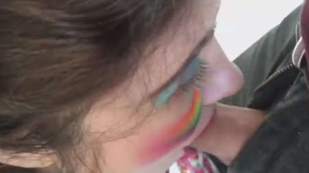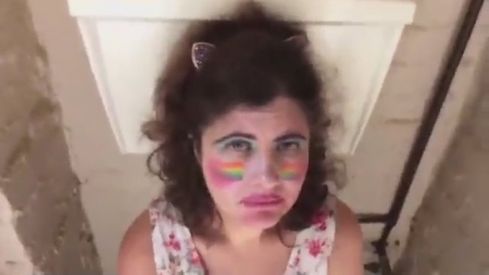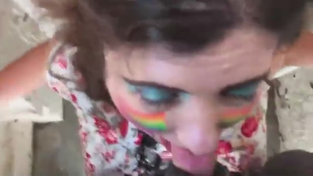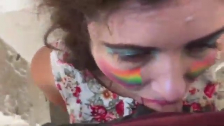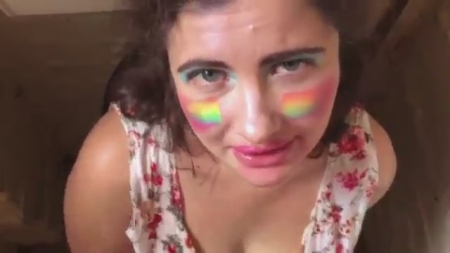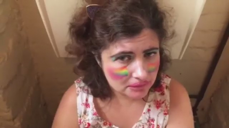 Чмошница с радугой на щеках в сортире сосет парню и дрочит себе пальцами