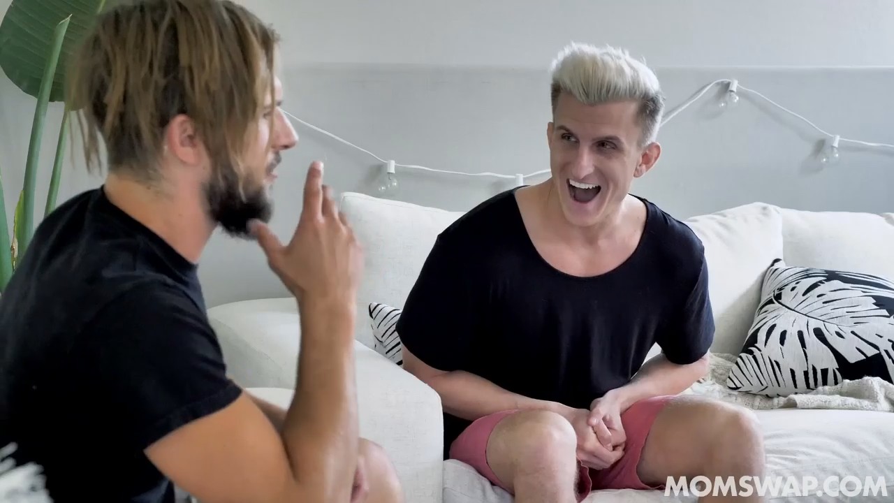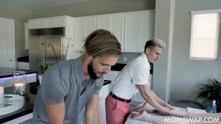 Женщины сидели на кухне и, как всегда, обсуждали половые вопросы. Это подслушали их отпрыски, выглядывающие со второго этажа и решившие развести женщин на потрахаться, сегодня как раз день матери, тут и подарок нарисовался сам собой. Парни распечатали поздравительные бумажки, попросив поскорее оголиться топлес и лечь на кушетки рядом друг с другом. Ребята поменялись мамками, ехидно поглядывая друг на друга. Неожиданно, милфы перевернулись на спину, показав четыре сиськи. Массаж стал более эротическим. Смекнув, что пора действовать, сынки приступили лямзать бритые и не очень дырочки мамаш друг друга, после чего одновременно дали им пососать, начав трахать стройных женщин совсем рядышком. Почти все прошло синхронно на 9 баллов.