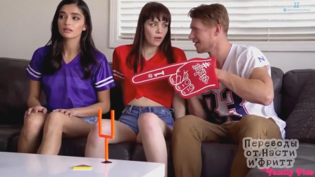 Фанатки регби оделись как шлюшки в ожидании футбольной трансляции по телевизору. Пока у них есть время поиграть в настольную игру, а нам увидеть как гостья засматривается на полуголую попку подружки. Подтянулся братец, начавший приставать к обеим по очереди, а когда получил отказ от сводной сестренки, решил разыграть вторую, засунув член в миску с попкорном. Эти две потаскухи перетрахали весь район, так что не удивительно, что подруга начала сосать при рядом сидящей болельщице, которая нахамила пацану, типа его член маленький. Тот в ответ упрекнул раздолбанность пизды и получил шанс проверить свое утверждение в крайне сексуальной групповушке.