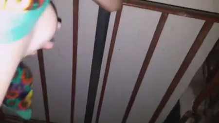 Не зря говорят "муж и жена - одна Сатана". Женщина предложила как-нибудь так потрахаться, чтобы была опасность быть застуканными. Первой же идеей стал ночной подъезд, куда супруга вышла в одном халате. Мужик будто вообще без одежды туда пошел. Это обычная панельная девятиэтажка, коих настроили в советское время очень много, они очень хорошо передают звуки, поэтому нужно было вести себя как можно тише. Бабенка на корточках раздвинула лапти, после чего призагнулась облокотившись на перила, чтобы муженек сам разобрался с ее пиздой, снимая как оттянутые сиськи бьются о раздетое тело.