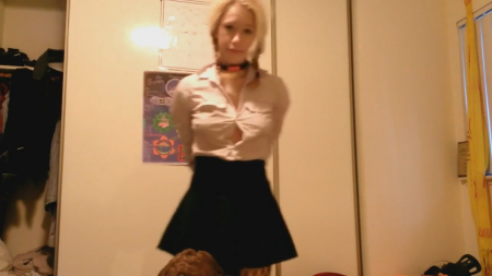 Прилежная блондиночка почитывала журнал когда вернулся ее бойфренд с инструментарием в руках. Он сходу заставил малышку подчиняться: надел ей на сосочки маленькой груди прищепки, поиздевался палкой с мягким наконечником и заставил сосать хуй. На руках молодой человек застегнул строительный бандаж (по простому - стяжка), заведя конечности подруги за спину. В такой позе ей пришлось встать рачком и дать оттрахать молочную писечку через небольшое отверстие в интересного фасона колготках. Она готова терпеть любое наказание, лишь бы член парня был почаще у нее внутри.