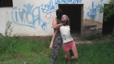 Светленькая девчуля вышла загород размять худенькое тело. Она не ожидала, что по лесу совсем рядом ходит сексуальный маньяк и уже вовсю наблюдает за жертвой. Жирдяй в балаклаве тихонько подошел сзади, но девушка стала картинно убегать, спрятавшись в ближайшей заброшке. Уже показалось, что опасность миновала, но ее схватили, привязав к развалившейся вышке. Насильник стал издеваться собачьим кайфом над привязанной, а когда та обмякла полностью (авторы назвали это game over), решил трахнуть ее холодеющее тело рачком на ступеньках, оставив биологические следы внутри. Видео срежиссированное.