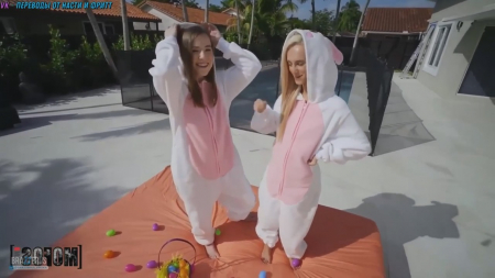 Новый житель субурбии встретил двух прикольных девчонок в костюме кроликов. Они в день Пасхи собирают яички, разбросанные по территории взрослыми, но им нужно больше. Парень узнал, что рост коротышек 140 и 138 сантиметров - таких маленьких потаскушек он никогда не видел, было бы забавно позвонить рослому товарищу, чтобы он забрал свой подарок. Рядом с ними он кажется просто Големом, с легкостью поднимающим на мощные плечи низкорослых незнакомок. Они с удовольствием занялись сексом на заднем дворе, сравнив размер его настоящих яиц с куриными - точь в точь! Все четыре маленькие руки помещаются на одном эрегированном члене.