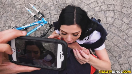 Темноволосая сучка насмехалась по телефону с подругой над одним чуваком-неудачником только за то, что он ездит на велосипеде. Произошел резкий удар - это девка сбила того самого пацана. Он почти не пострадал, но может обратиться в больницу, а оттуда уже придет запрос в полицию на расследование, телочку лишат права управления транспортным средством, так как она не использовала гарнитуру. Беднягу шлюшка поставила задницей к капоту и стала сосать его ствол сидя на корточках. Она и не знала, что у такого задрота может быть большим. Следом она расчекрыжила пирожок под открытым небом, все также использовав свой автомобиль.