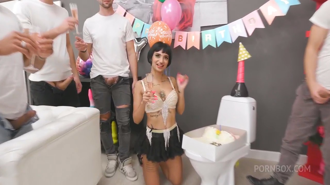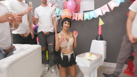 В комнату с несколькими парнями завели татуированную шлюшку с завязанными глазами. Нетрудно догадаться по окружению, что француженку собираются поздравлять с днем рождения и подарить каждый член присутствующего. Она с радостью отсосала всем белым и черным ребятам, а потом усадила очелло на два кукана сразу. Своевременная растяжка еще никому не вредила, тем более в такой странной ситуации, когда тебе ссут в жопу и рот, ставят унитаз и наполняют его соленой жидкостью, окуная туда лицом. Козлы даже большой торт обоссали, накормив им и спермой.