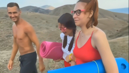 Двое ребят заприметили парочку незнакомок, идущих домой с пляжа. При знакомстве они как дурочки смеялись, пытались обойти наглецов и продолжали хранить томительное молчание, никак не реагируя на предложения свернуть налево. В какой-то момент четырехглазые подружки присели на холме, их облапали, пытаясь разузнать возраст, но они только ржали и ничего с этим не делали, а когда увидели перед лицом два члена, принялись сосать и трахаться. Так как парни не взяли с собой штатив, им пришлось по очереди снимать друг друга и милых русских шлюшек, классно стонущих на природе.