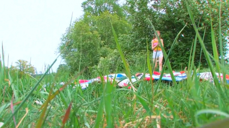 Молоденькая девчонка пошла отдохнуть возле речки одна-одинешенька. Подходя к месту, она сняла с себя маленькие шортики и пописала. В этот момент за кадром слышны щелчки фотоаппарата. Еще неизвестно сколько людей будет смотреть на шалости худенькой с огурцом, который та достает как только ложится на расстеленный плед. Хорошенько его обсосав после конфеток, юная онанистка начинает вгонять в себя овощ. Для киски такие размеры еще не подходят - влезает только наполовину, но и этого достаточно, чтобы испытать желаемый эффект, закусив его оставшимися сладостями.