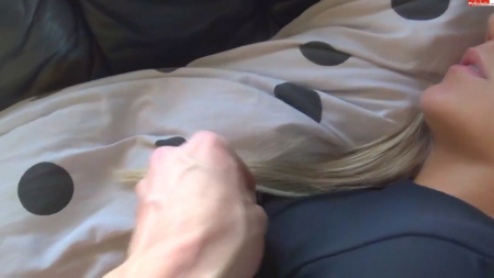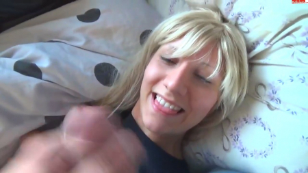 Гражданин с камерой устал ждать когда проснется его подружка-поблядужка, поэтому стал трогать ее в разных местах за трусиками и щупать за сиськи. Белогривая арийская тигрица ну никак просыпаться не хотела, даже от дружеской ласки. Придется поступить по-другому, заодно развлечь себя рядом с носатым лицом, подрочив кукан на Ленку-Дырку, постепенно приходящую в сознание, но не собирающуюся никоим образом помогать кончить. Единственное, что заставило ее проснуться полностью - добротный камшот на улыбающееся белыми зубами лицо.