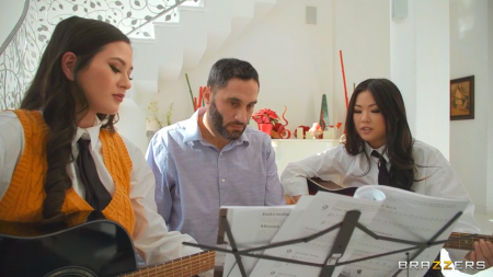 Сдружившиеся девушки занимаются музыкой у своего учителя на дому. Пока его не было, они даже не смогли толком настроить гитары, чтобы сыграть хоть одну мелодию, которая, кстати, совсем не понравилась хозяину жилища, севшему между девчонками. Дурочкам стало понятно, что мужчина совсем из себя такой стеснительный и нужно ему дать расслабиться, а групповушка с двумя молоденькими чиками, среди которых азиатка и чистокровная американка, - лучшее решение зажатости. Может хоть после тройничка музыка польется рекой из инструментов? Но нет, они трахаются лучше, чем играют, не в моем темпе!