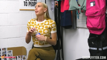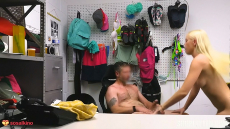 На сей раз охраннику магазина попалась очень странная воровка, честно признавшаяся, что украла бутылку воды. Обычно долго приходится выбивать показания, а кроме этого на ней больше нет никаких записей, это первый залет. Пока секьюрити проверял на компьютере ее личное дело, она вновь уставилась в камеру наблюдения и позвала мужчину обратно, так как очень по нему соскучилась и вообще хотела бы, чтобы он провел обыск - мало ли чего она успела в себя спрятать поглубже. Пришлось выполнять лишнюю работу, проникнув пальцами внутрь пизденки блондинки. Девчонка села на попку и раздвинула ноги, предложив ее отыметь на столе маленькой комнатки. Боясь увольнения, незнакомец согласился пойти на сексуальные уступки, удовлетворив похотливую сучку.