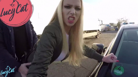 Проезжая на своем личном автотранспорте, типичный немец увидел стоящую на дороге придорожную проститутку, которая сразу подошла как только тот сбавил скорость. Она очень привлекательна и готова показывать всем своим потенциальным клиентам собственное тело и красивые ножки под короткой юбкой. Телочка на шпильках мужчине очень понравилась и они вместе отправились на парковку большегрузов, где блондинка призагнулась рачком, закинув одну ногу на капот тачки клиента. Парочку не видно другим из-за фур, поэтому они потрахались публично и им никто не помешал.