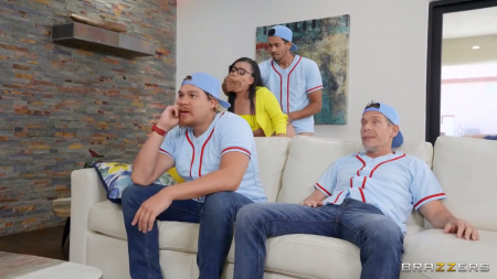 Будущий муж пышной брюнетки в очках вернулся домой с тренировки вместе с двумя своими друзьями. Они передали биту хозяйке и та сразу стала пытаться соблазнить, захотелось кое-что большое, словно эта бита. Сперва распутная девка выбрала одного чувака, отсосав ему за спиной бойфренда, потом другого. Чуть позже они все вместе встретились в спальне и долго ебались - уж слишком был ее парень увлечен игрой по телевизору, а когда все же решил всех отыскать, то наткнулся на обнаженную троицу, оставив их минут на десять в покое. Но они не прекратили заниматься групповухой, а дождались когда их выгонят из дома.