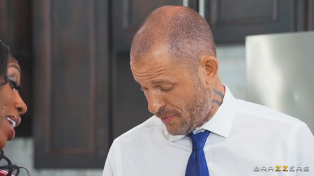Излишне жопастая негритянка будто ненароком полезла в холодильник, заигрывая пятой точкой перед не обращающим на это внимания супругом. От этого она просто вскипела, но от семейного скандала спас звонок в дверь - пришла черная подруга вместе со своим обольстительным мужем. Обе семьи сели за стол, но тут случилось необычное - гостья стала ласкать пальцами смуглянку между ног, а потом и вовсе отлизала, уведя продолжать секс по-лесбийски на кухне. Второй гость просторного дома тоже отправился следом, устроив классный межрасовый тройничок с двумя негритянками, пока муж хозяйки тупит за столом в одиночестве.