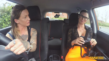 Водитель такси дождавшись пассажирку отправилась выполнять заказ. Клиентка в коротенькой юбчонке и тесной кофточке, из которой так и выпирала большая сочная грудь, решила прорекламировать водителю свой товар - страпон. Клиентка не только показала, но и предложила опробовать секс игрушку, на что татуированная шофиня мгновенно согласилась. Предприимчивые дамы разложили сиденья кресел и пассажирка оттрахала водителя страпоном.