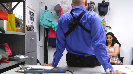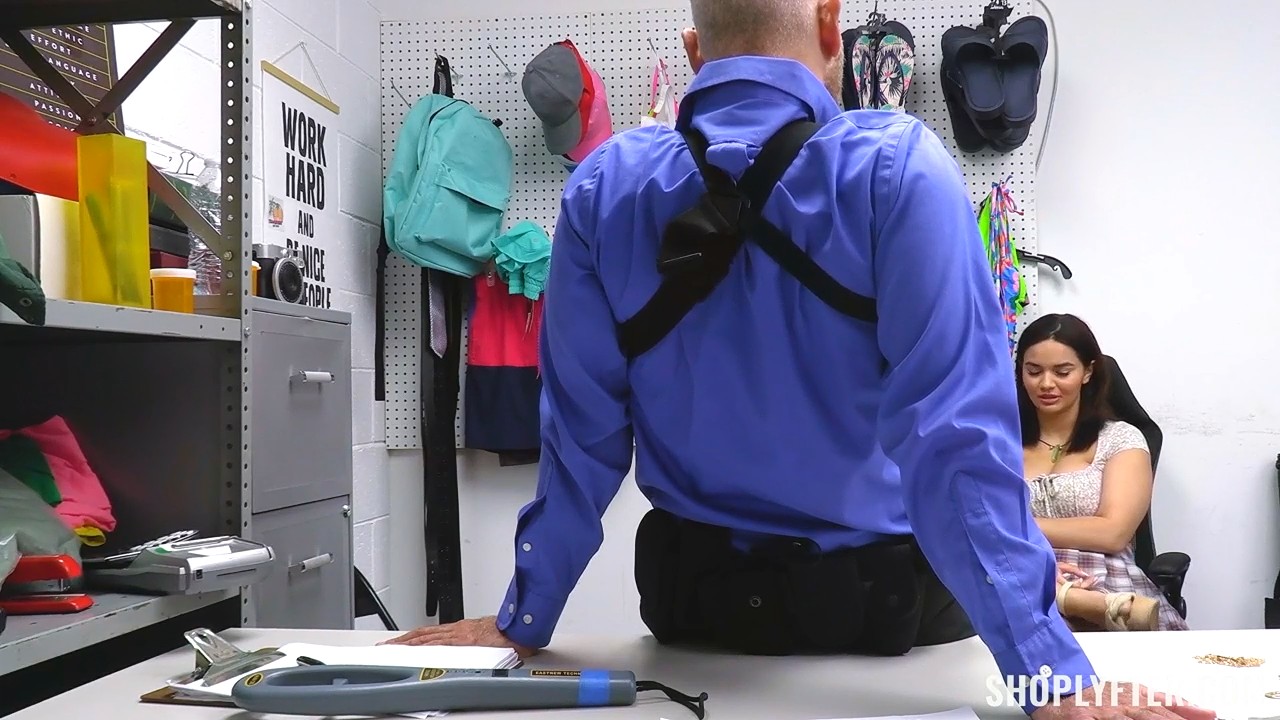 В этот раз секьюрити магазина очень мило общается с юной девушкой, попавшей к нему в личный кабинет. Все из-за ее больших натуральных сисек и пышной задницы. Но работу приходится делать несмотря на личную симпатию, поэтому мужчина приступает к досмотру, не обнаружив в трусиках ничего лишнего, а вот в районе груди под одеждой было распихано очень много украшений. Теперь не так много вариантов есть у воровки: либо полицейские забирают шоплифтерку в участок, либо ее сейчас тут раздевают догола и трахают, после чего у блудницы появится шанс на реабилитацию.