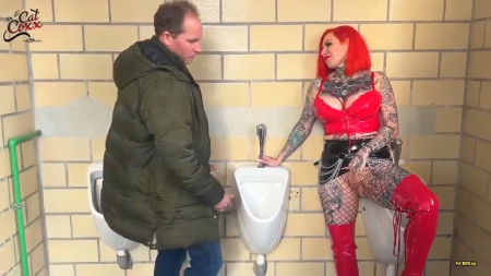 Немецкая прошмандовка с красными волосами поставила одну ногу на писсуар, чтобы входящий справить нужду незнакомец мог сразу оценить ее влагалище. Грязный рот быстро смог уговорить только что отлившего скуфа дать ей пососать, после чего шлюха с пирсингом в капюшоне клитора встала рачком. Случайные любовнички не побрезговали трахаться и прямо на полу привокзального сортира, где шалаве пришлось ненадолго слезть с кукана и быстрыми движениями дрочки вновь сделать его очень крепким, чтобы тот уже наконец-то кончил в ее бритую пизду. Мужчина ушел, а вот героиня стала ждать следующего претендента.