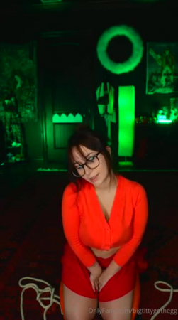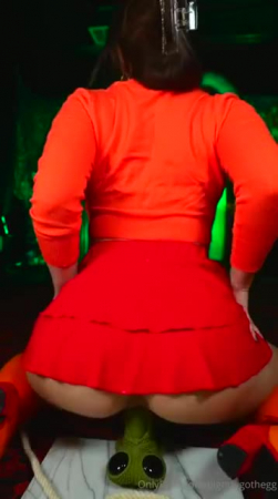 Все друзья куда-то потерялись и Велма осталась одна. Она нашла тихое помещение с инопланетным монстром, с которым завела беседу. Он ничего не отвечал, но и не нападал, зато его большой зеленый пенис торчал и привлекал слишком много внимания девчонки в очках. Велма из Скуби-Ду решила воспользоваться ситуацией и немного поприседать на странный фаллоимитатор сверху, приподняв юбочку так, чтобы было видно ее сексуальную попку. Ведь не обязательно же рассказывать остальным чем она тут занималась несколько минут, верно же?!