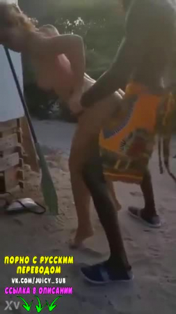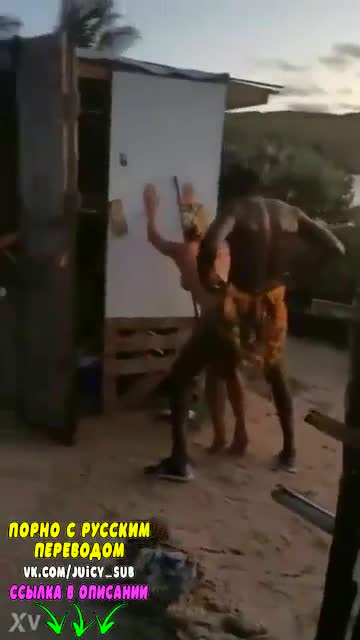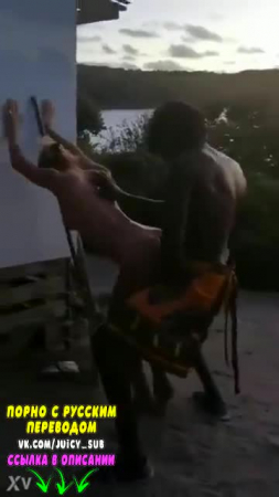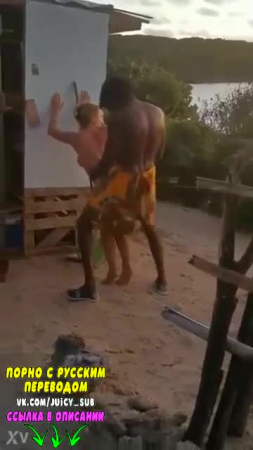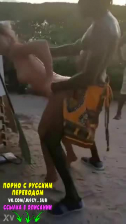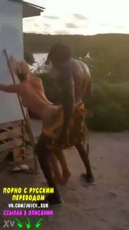 Очень фигуристая секс-туристка на цыпочках стоит возле хижины, наполовину обернувшись к трахающему ее сзади черному туземцу. На улице вокруг собралась целая толпа мастурбирующих зевак и, кажется, там даже еще одна девушка стоит без участия и смотрит на разврат. Жаль, что качество не позволяет разглядеть всю картину в нормальном виде, но явно любительнице острых ощущений и секса с незнакомцами очень неплохо было в тот момент на острове.