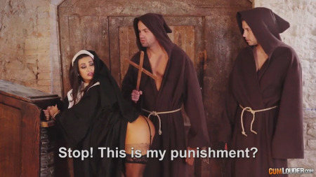 Симпатичная монашка, скрывающая под рясой соблазнительное тело с аппетитными манящими прелестями, была отшлепана двумя молодыми монахами. Мужчины наказали девушку, в которую "вселился бес" и повел милую девушку прямиком к аду. Проще говоря, девушка недавно приняла постриг и озабоченные монахи решили воспользоваться этой возможностью. Молодые мужчины выебали вдвоем стройную блудницу и накончали ей в рот.