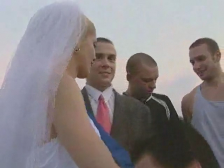 Свадьба - счастливое и волнительное событие! Молодожены некоторое время назад расписались и теперь неподалеку от загса празднуют - дружок жениха повсюду разбрызгивает шампанское, все остальные веселятся. Но молодым супругам нет до этого никакого дела, потому что "стандартный" поцелуй перерастает в страстный, полный вожделения. Не стесняясь своих знакомых, невеста "кадрит" жениха, который опускается на колени и лижет любимой вагину. Похотливая девушка после таких ласк делает супругу минет. Возбуждаются и все присутствующие гости (одни мужики). После члена мужа шлюшка "идет" по кругу, принимая члены остальных и в ротик и в вагину.