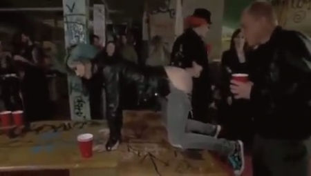 Короткостриженная милаха немного перепила и начала искать приключений на свою попу. Неформалка встала раком на столе и стала ждать - причем долго не пришлось. Желающие поразвлечься с симпатюлей нашлись сразу (если учитывать что все произошло в самый разгар вечеринки). Ребята разорвали джинсы на девушке по шву и начали свои атаки - и девчонки и парни (да все желающие) стали понемногу возбуждать шалашовку, а потом овладевать мокрыми дырками.