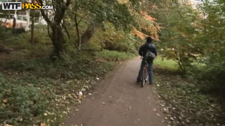 Охотник на легкодоступных жертв женского пола вышел прогуляться с камерой в поисках извращенной незнакомки, которая согласиться переспать с ним в любом месте, даже на улице. Ему на глаза попалась девушка с крашеными черными волосами, которая выбирала плитку на уличном стенде. Мужчина начал вести разговор о плитке, узнал что она напольная и какая нравится затеявшей ремонт девушке. Парень ей сразу понравился, телочкам нравится подвешенный язык у молодых людей. Разговорившись она дала понять, что не против пошалить в ближайшем лесочке и что нравится эксгибиционизм в легкой форме. Вместе пара направилась в сторону парка со множеством деревьев, а самка иногда оголялась публично, дразня оператора. Добравшись до подходящей точки они заметили парня на велосипеде, он стоял спиной, но заниматься сексом при нем - просто не вариант. Тогда ребята отправились немного подальше, где чернявая эксгибиционистка заявила, что всего один раз трахалась публично и это интересно попробовать вновь. Чтобы никто потом ничего не заподозрил и были пути отхода, мужчина расстелил плед с фруктами, на который и встала рачком брюнетка, предварительно попробовав член нового знакомого на вкус. Удивительно как мало спермы выделилось из пениса в самом финале.