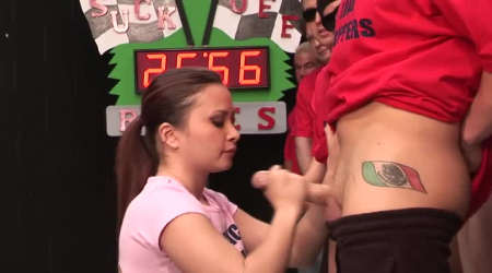 Японка с хвостиками выдаивает сперму в ладони и на язык